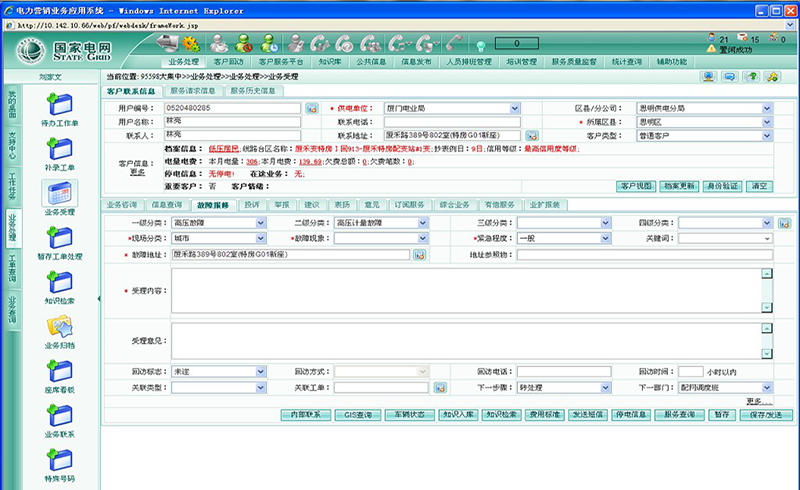 基于GIS地图,为座席人员提供故障信息、停电信息可视化功能;基于客户信息、业务及情绪模式识别,为座席人员提供业务信息智能化功能;基于数据分析与挖掘技术,为管理人员提供运营评估功能。