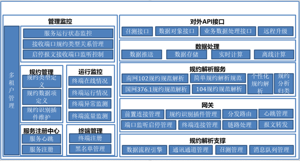 网关服务包括服务注册、端口监听、规约完整性处理、终端连接管理、规约解析服务连接管理、路由负载均衡管理、报文转发处理。