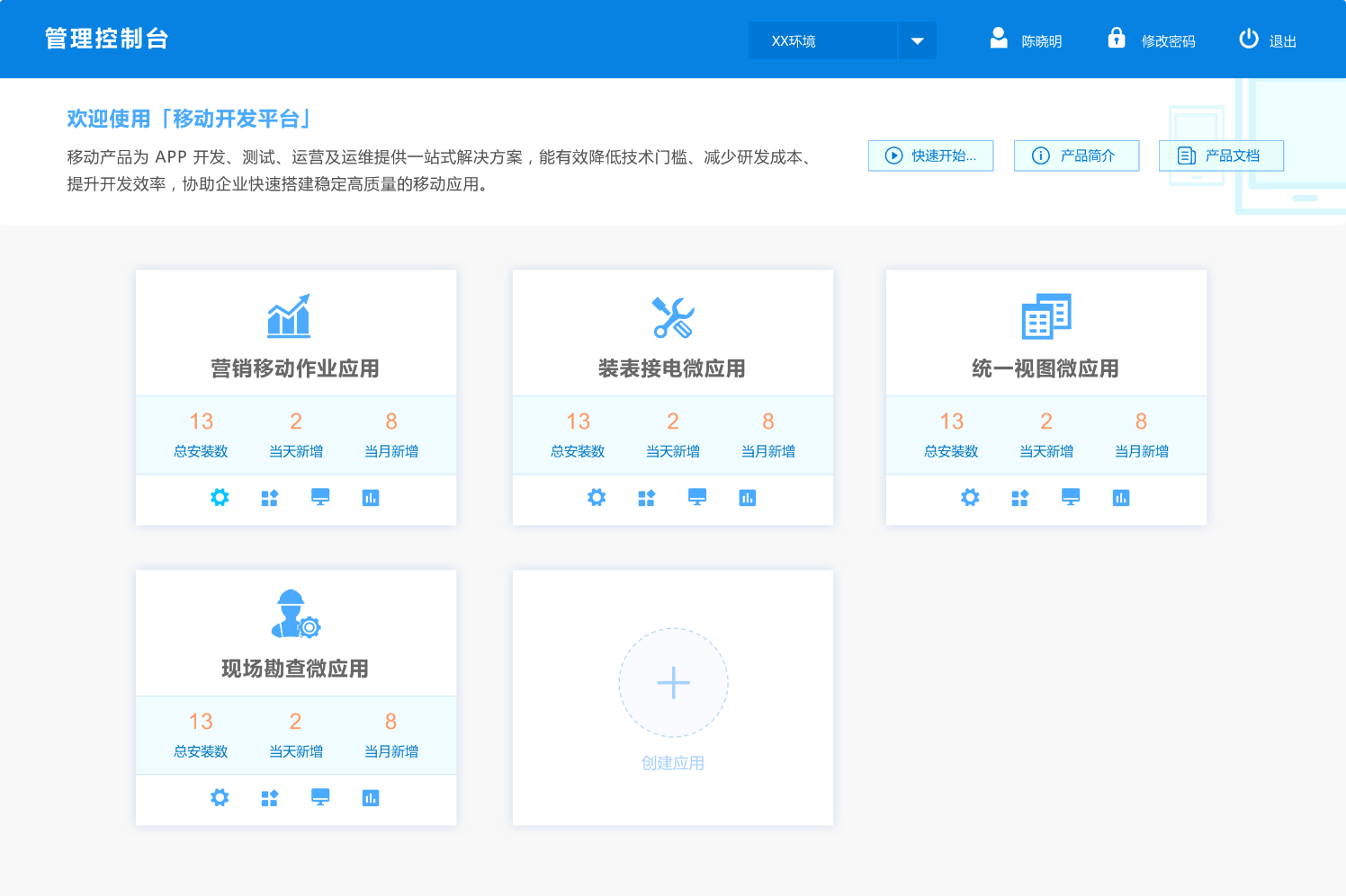 管理控制台展示移动应用入驻、发布、监控、运维等生命周期管理,实现营销、运检等电力业务的末端融合,达到“一平台、一终端”的目标。
