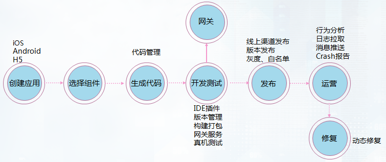 支持iOS、Android、H5等App应用的创建、生成代码、开发测试、发布、运营的全生命周期管理。
