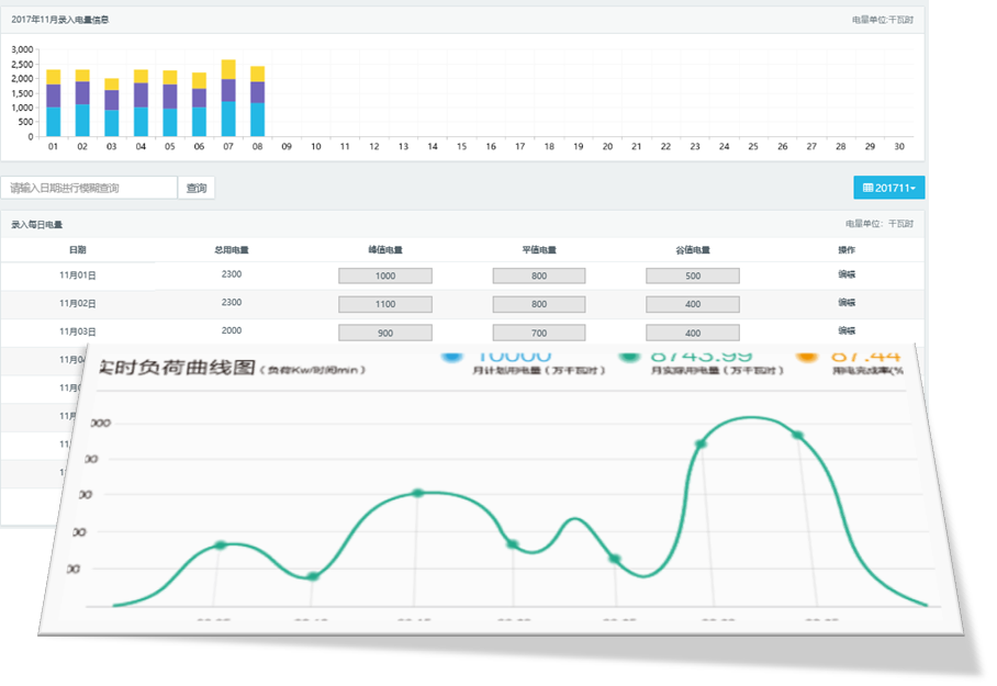 (2)无电能管理系统:通过用户手动输入方式,可提供日用电负荷数据、日用电量数据、月用电量数据、生产管理计划或生产KPI数据等;
