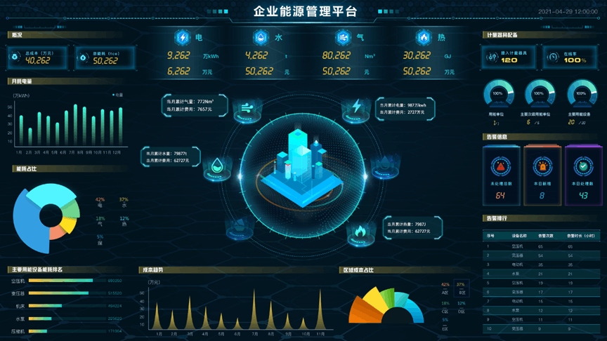 针对企业能源工艺系统的分散性和能源管理要求的集中性特点,以电、水、热、气等多种能源介质数据的计量、采集,提供能源监测、能源质量、能耗告警、能耗分析、能效诊断、节能管理等服务,助力企业实现能源管理的优化与再造、提高能源管理效率、减少能源管理成本,持续挖掘节能潜力、提出节能技术措施和管理措施、达成节能降耗目标