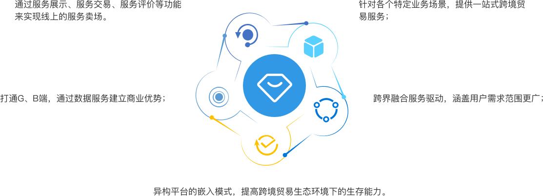 该产品为跨境贸易相关的政府部门、商家或个人对接、提供服务的互联网平台。服务种类包含但不限于: 云端软件类服务(SaaS服务),云端数据类服务(DaaS服务),线下服务的线上交易与跟踪(云服务)。金年会app下载官网云商作为平台的主办方,以第三方营运者的角色介入,通过聚合对外贸易环境中生态的力量,为外贸参与者提供的配套一站式服务供应链平台;为服务的供应商与需求方提供技术支持、信息及交易流通的平台。