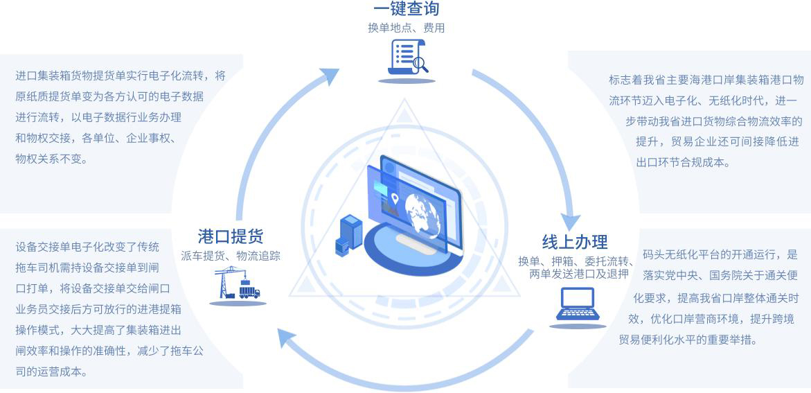 数据多跑路、企业少跑腿:以电子化方式实现换单、集装箱提货单、设备交接单、查验费缴纳、运抵报告、港口建设费缴纳电子化流转功能。企业仅需到船代公司递交国外发来的纸质提单,即可派车到港口提取货物,实现“只跑一次腿”。