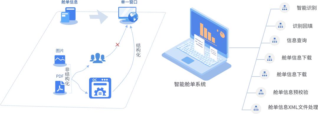 对于国际贸易业务量相对较小,信息化程度较弱地区企业基本采用Excel工具或者纸质单据对舱单数据进行管理,舱单数据录入工作量较大,错误率较高。智能舱单系统是在单一窗口标准版海运舱单系统的基础上面向企业提供“原始舱单、预配舱单、装载舱单、进出口理货报告、运抵报告”五大核心单证的便利化申报服务,兼容多种格式申报文件,降低企业录入工作量,提升舱单申报准确率。主要包括智能OCR单证识别、Excel申报数据导入、EDI报文导入、XML报文导入、报文申报、回执报文解析、数据查询等核心功能。
